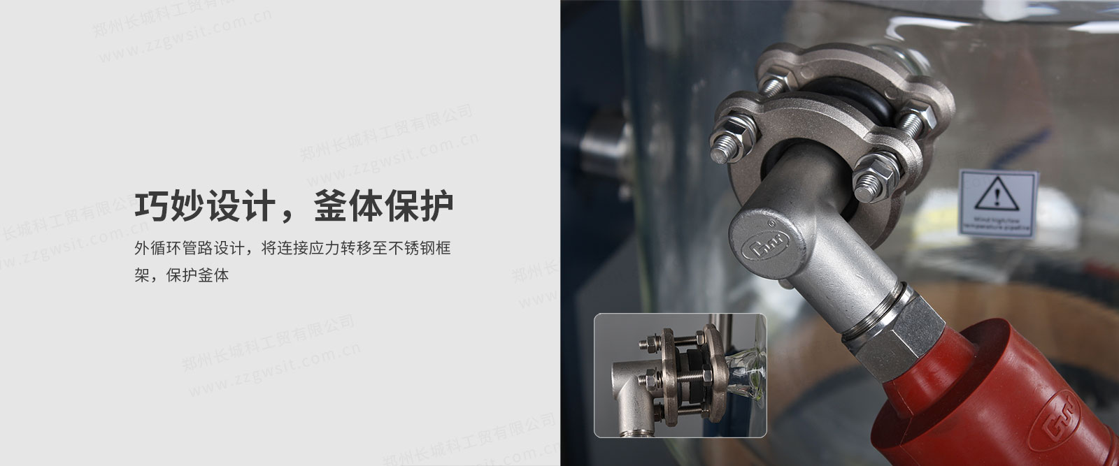 ● 夾套進(jìn)、出液口連接不銹鋼保溫軟管,減少進(jìn)出液口應(yīng)力。